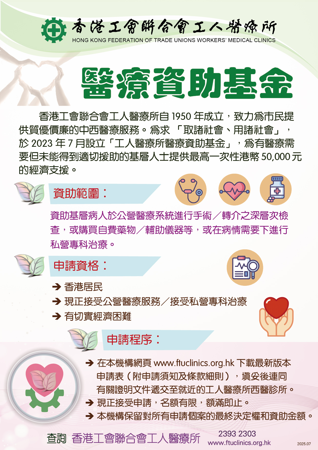 香港工會聯合會工人醫療所自 1950 年成立,致力為市民提供質優價廉的中西醫療服務。 為求 「 取諸社會、用諸社會」,於 2023 年 7 月設立「 工人醫療所醫療資助基金 」,為有醫療需要但未能得到適切援助的基層人士提供最高一次性港幣 50,000 元的經濟支援。