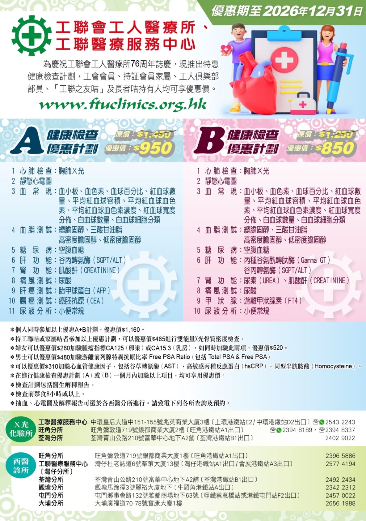 為慶祝工聯會工人醫療所76周年誌慶,現推出特惠健康檢查計劃,工會會員、持證會員家屬、工人俱樂部部員、「工聯之友咭」及長者咭持有人均可享優惠價。